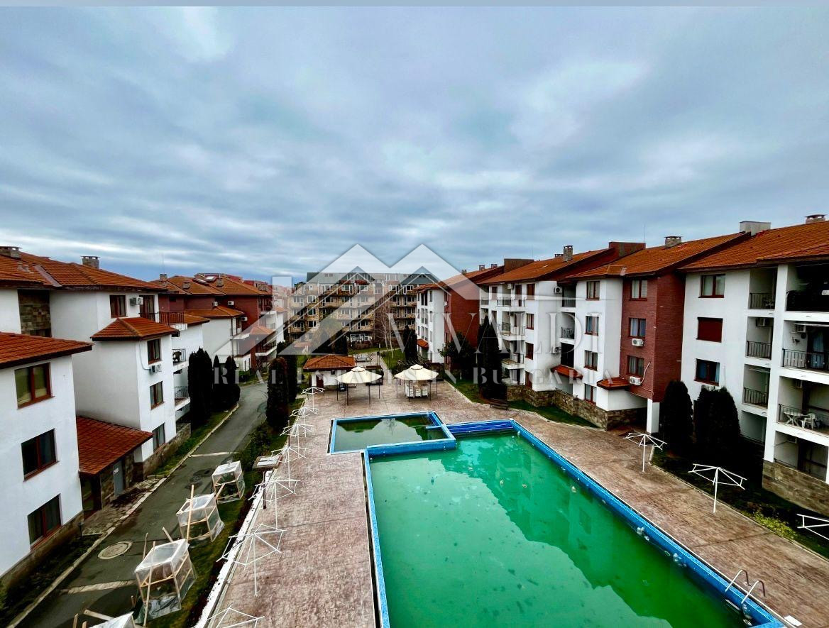 Апартаментът е напълно обзаведен и с гледка към вътрешната част на комплекса и басейна.